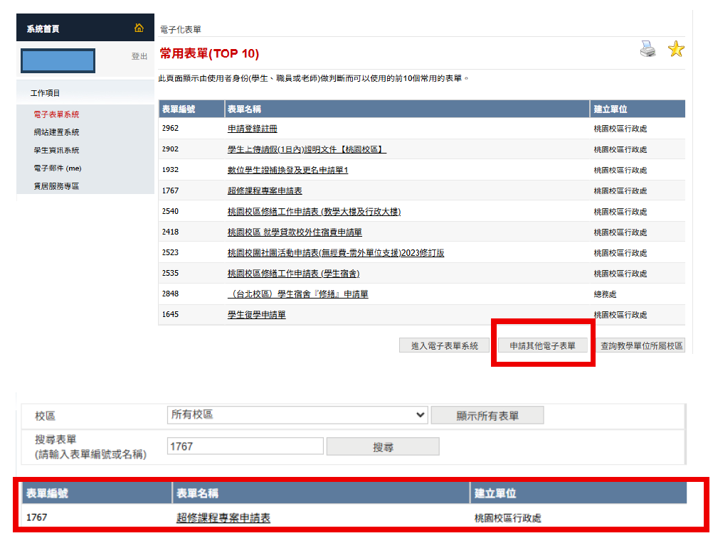 2️⃣登入帳號密碼,並尋找表單編號 1767,超修課程專案申請表